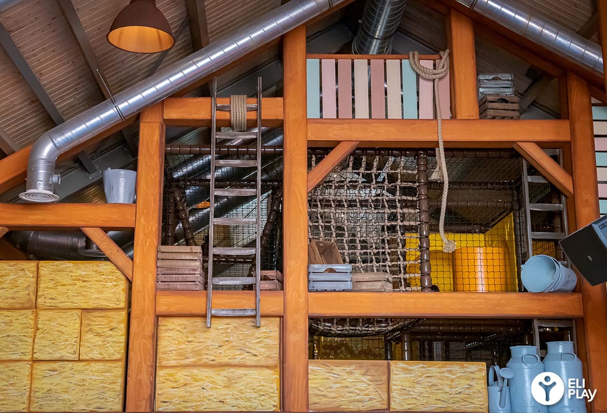 In het hart van de binnenspeeltuin bevindt zich een grote ballenbak met een interactieve dumping basket. De ballenbak is gevuld met beige en lichtbruine ballen, die symbool staan voor de eieren van de kippen op de boerderij. De ballen worden omhoog gezogen en vallen daarna als een vrolijke “ballendouche” naar beneden – een uniek speelelement dat het boerderijthema tot leven brengt en kinderen keer op keer verrast.