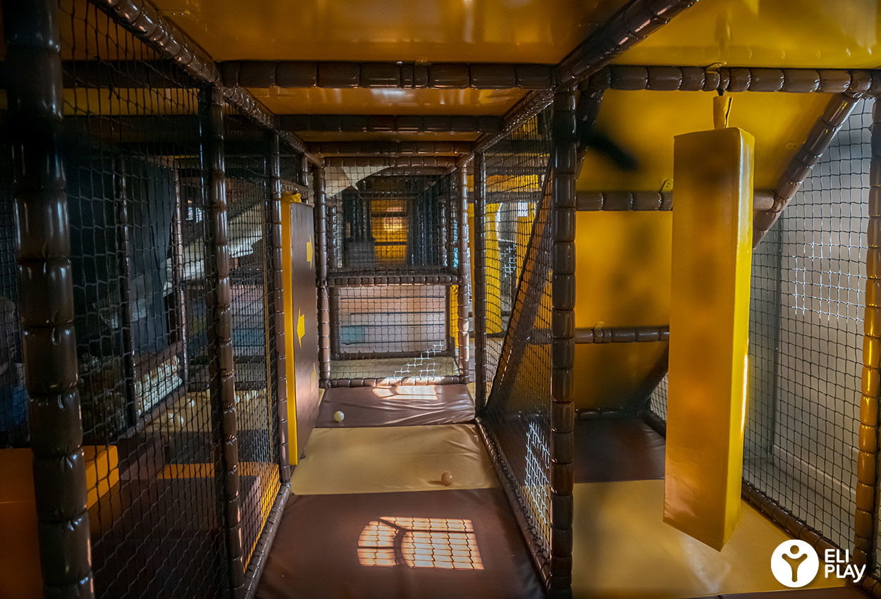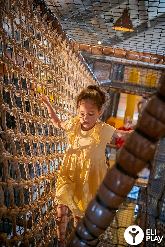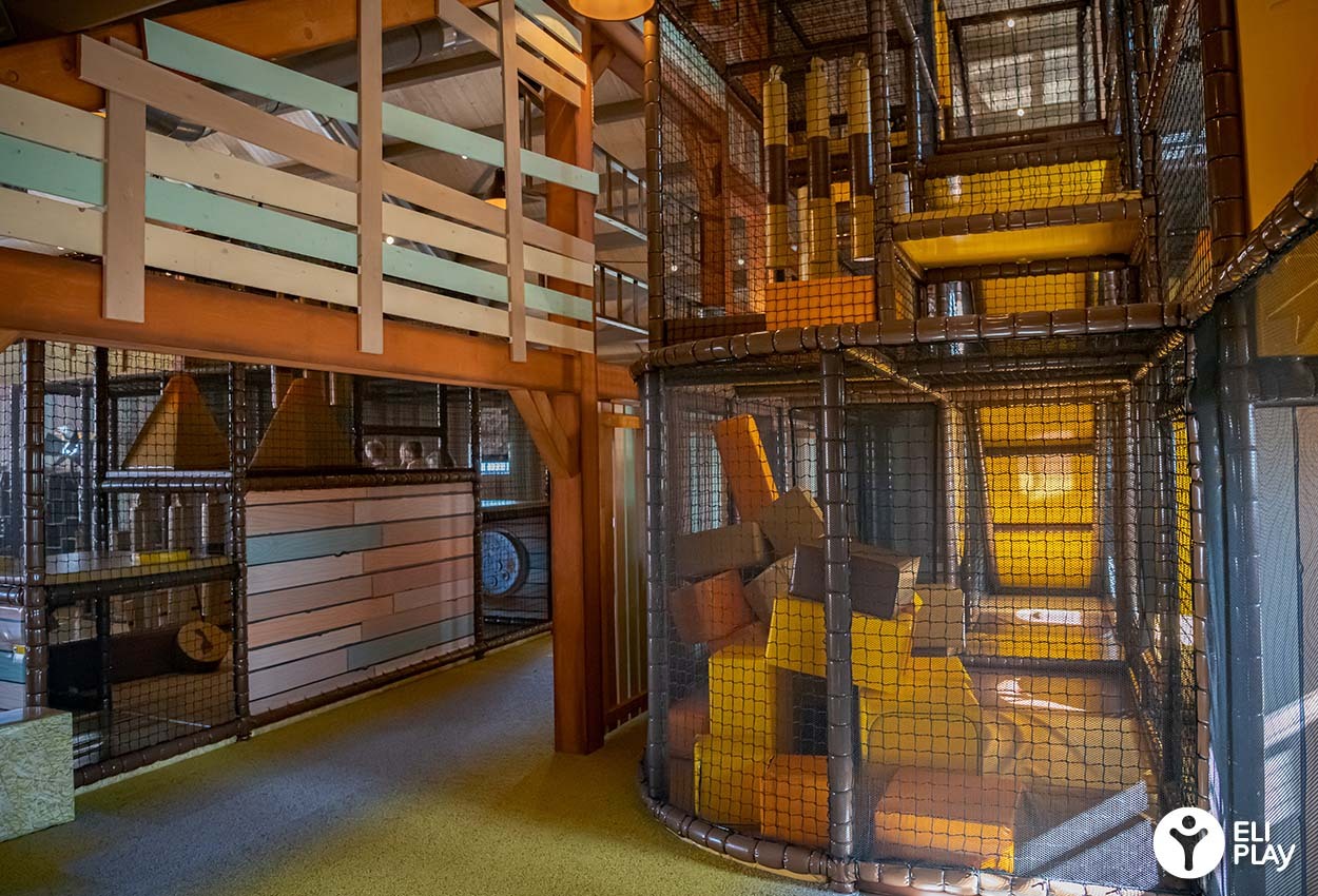 De grote speelstructuur biedt volop uitdaging voor kinderen van alle leeftijden. Via stevige touwbruggen, kruipgangen en klimroutes ontdekken ze elke hoek van de indoor speeltuin.